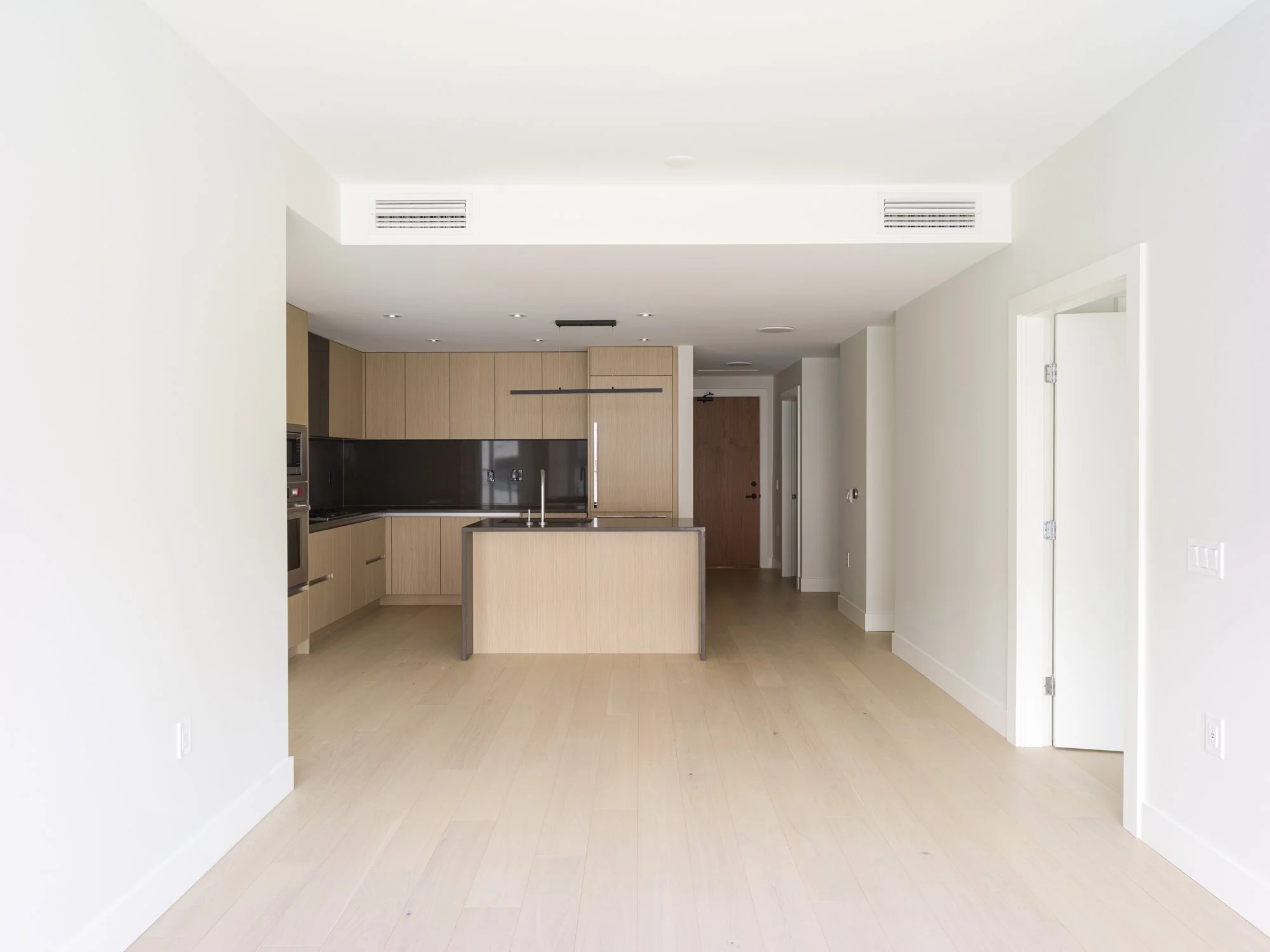 Residence 205 exemplifies the care and craftsmanship found throughout the building. Offering 1,118 square feet of beautifully planned interior space and an additional 200+ square feet of outdoor terrace, the home blends generous proportions with refined finishes. Inside, residents enjoy 9-foot ceilings, wide-plank hardwood flooring, full-sized washer and dryer, motorized blinds, and individually controlled forced-air heating and cooling for year-round comfort.