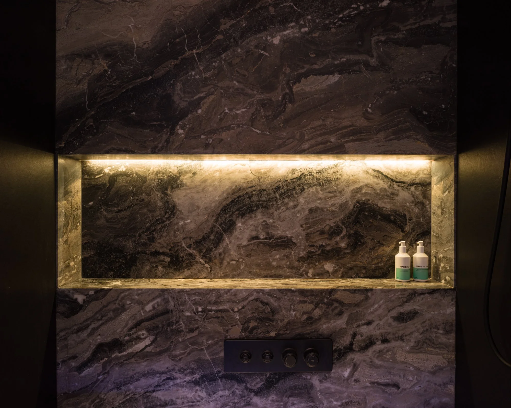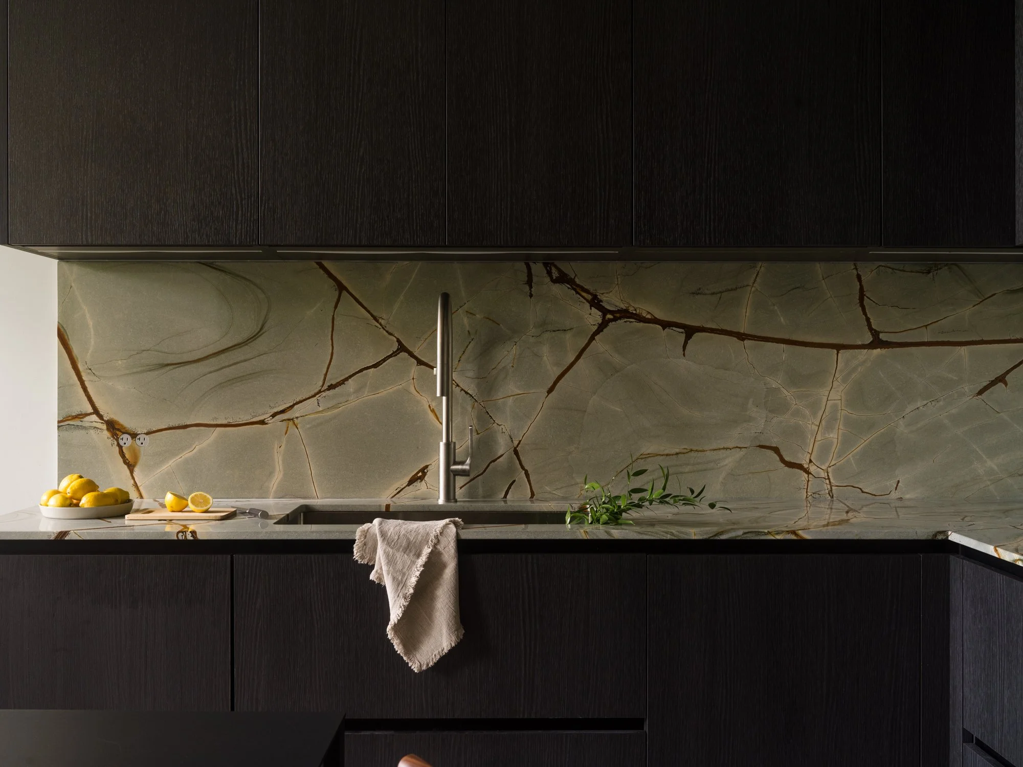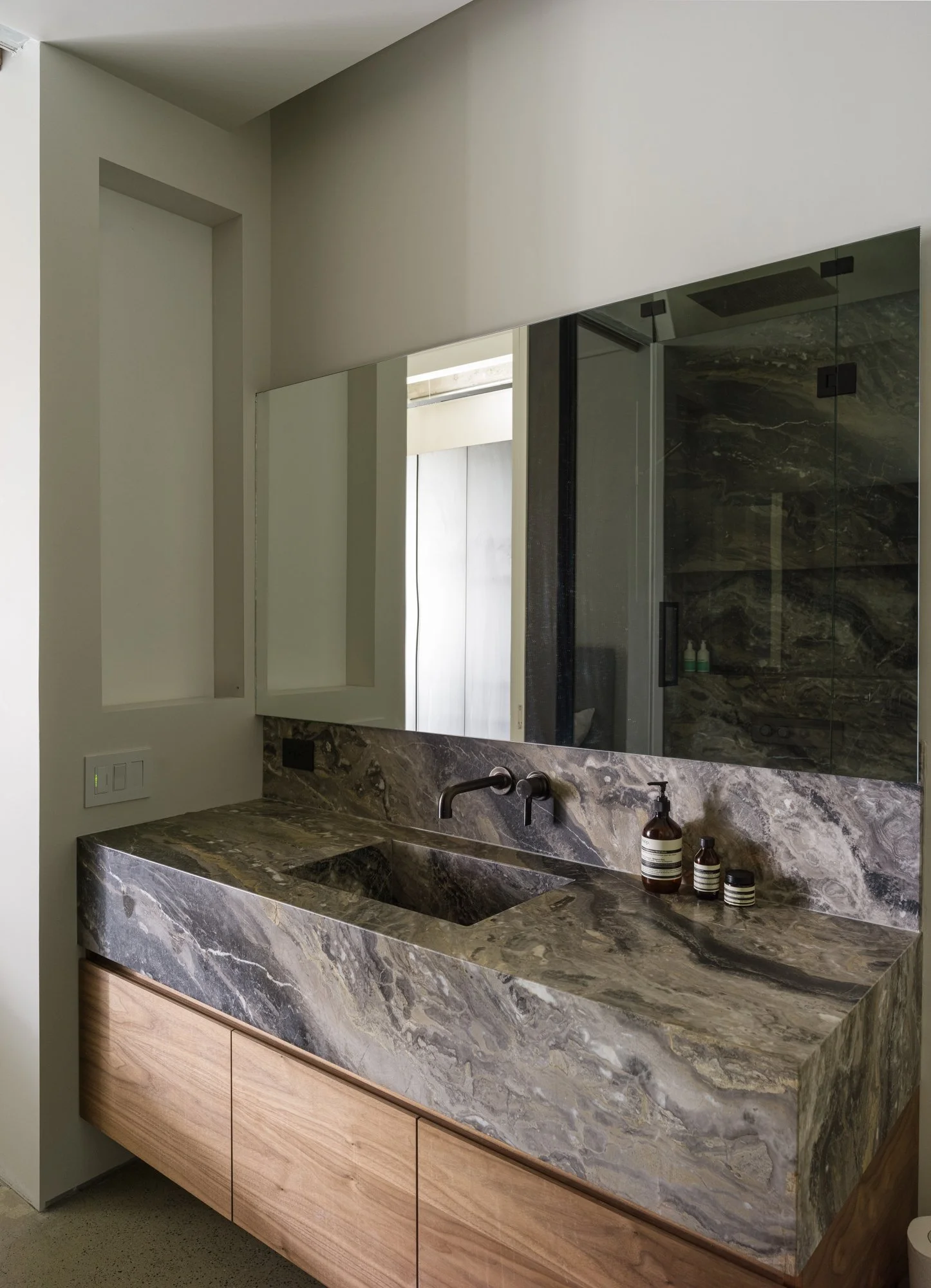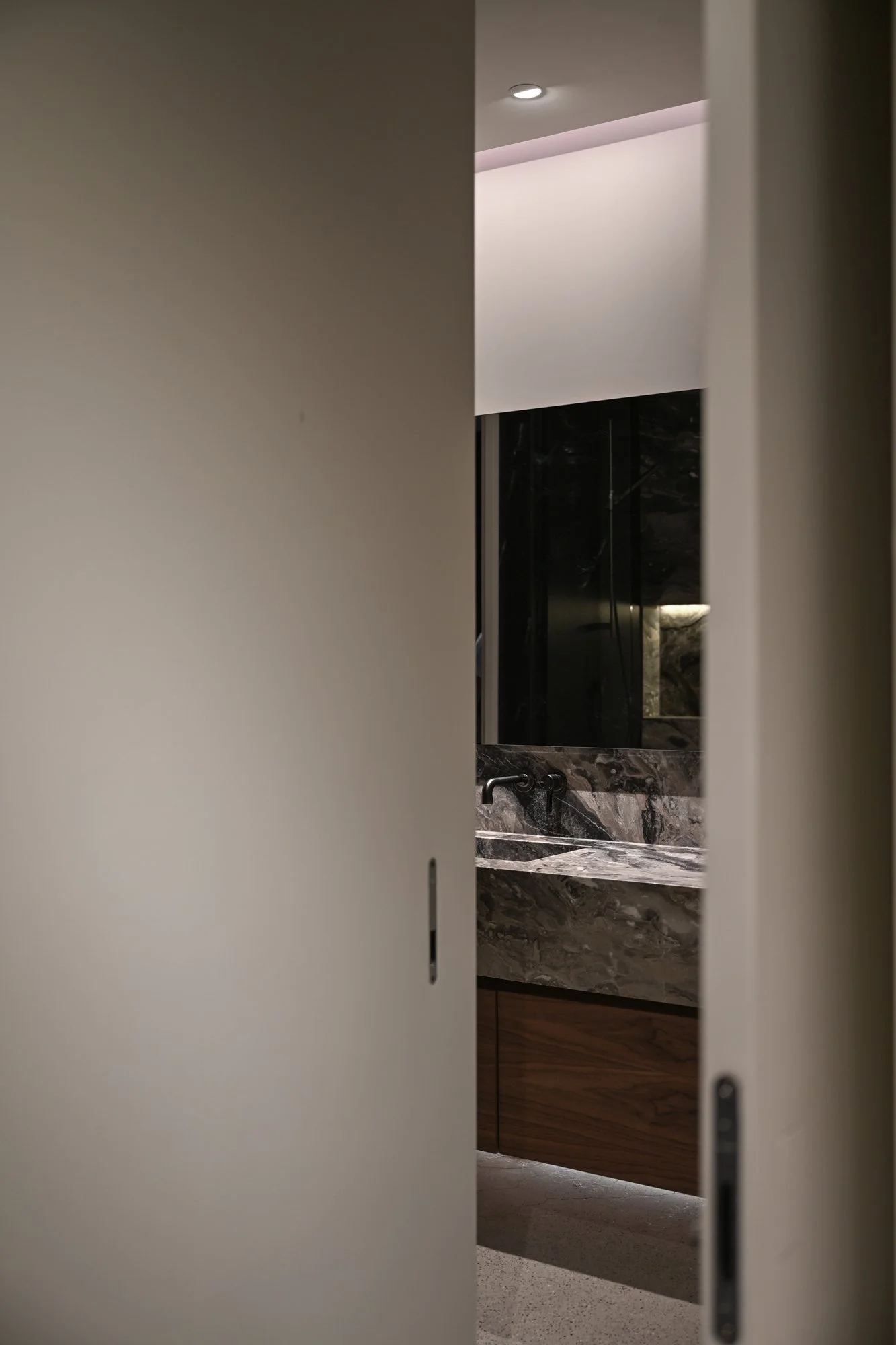 Storage solutions are equally considered, with an entire wall of bespoke Italian wardrobes by Inform Interiors providing seamless utility. In the bathroom, a palette of rich stone and walnut sets a serene tone, featuring a custom vanity and a steam shower appointed with sculptural fixtures by Gessi.