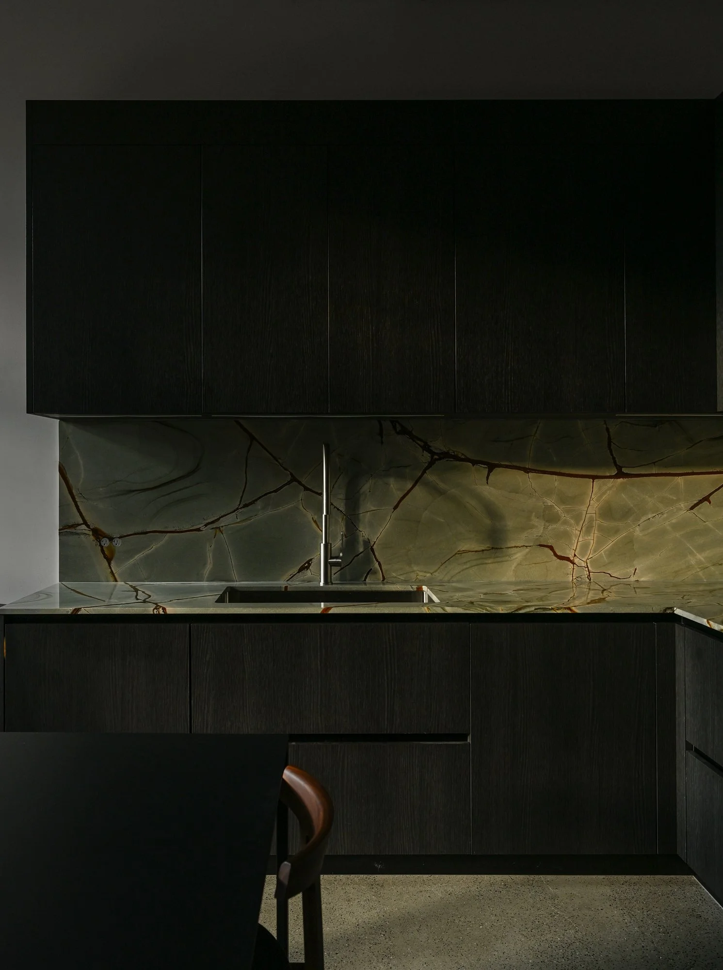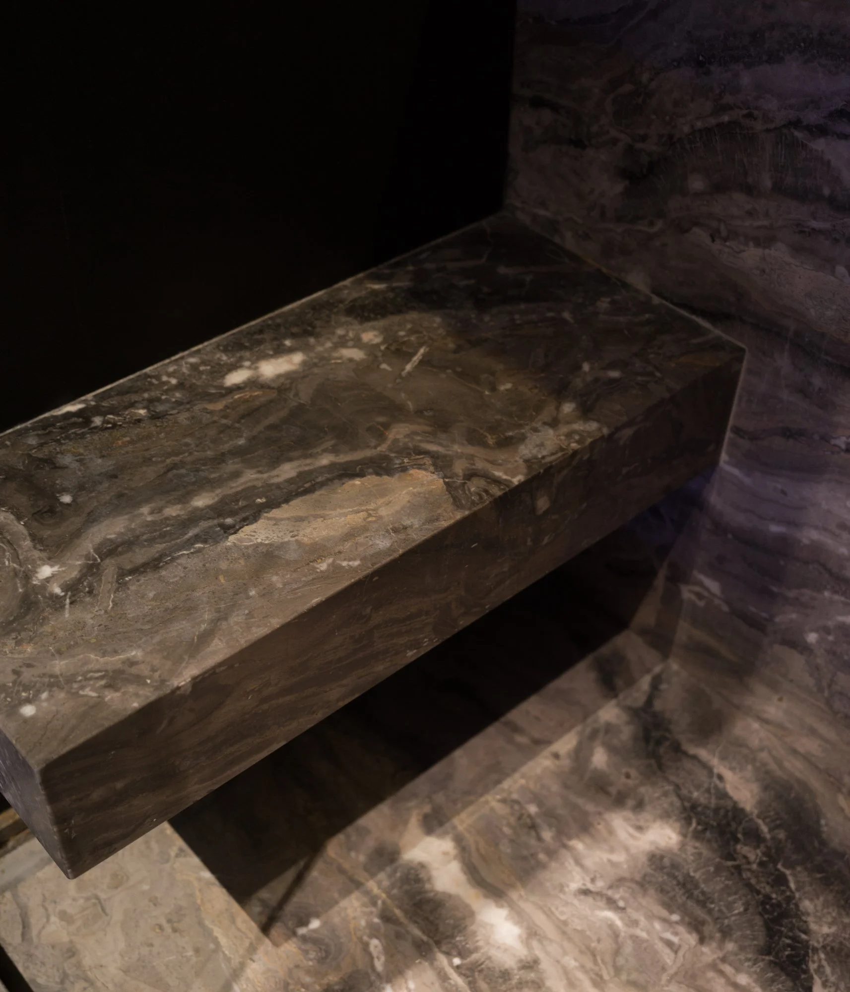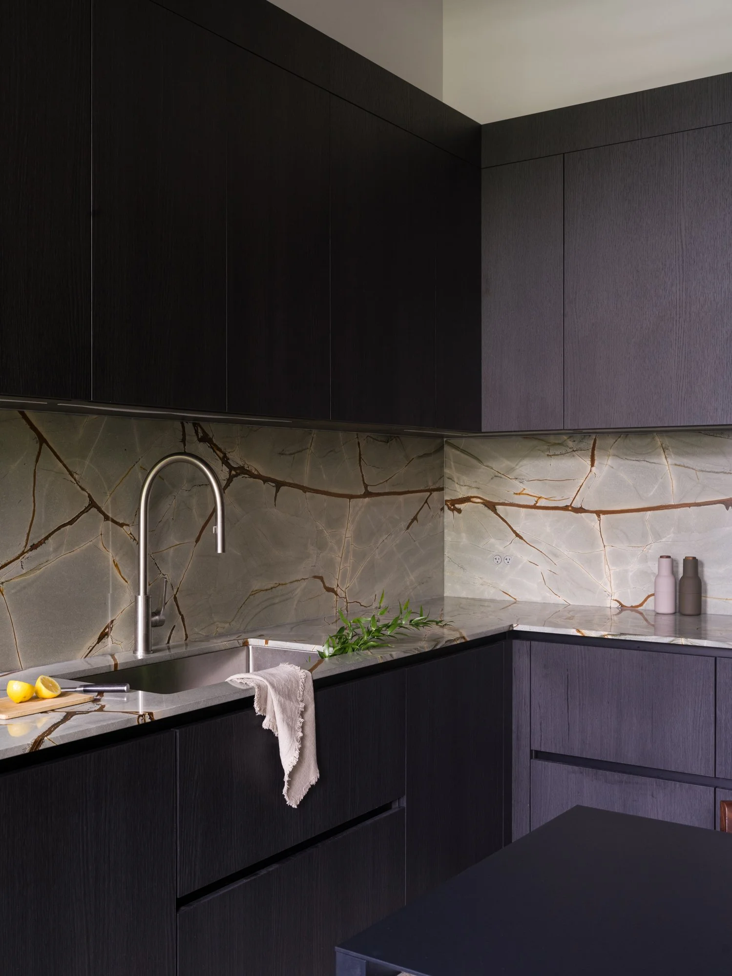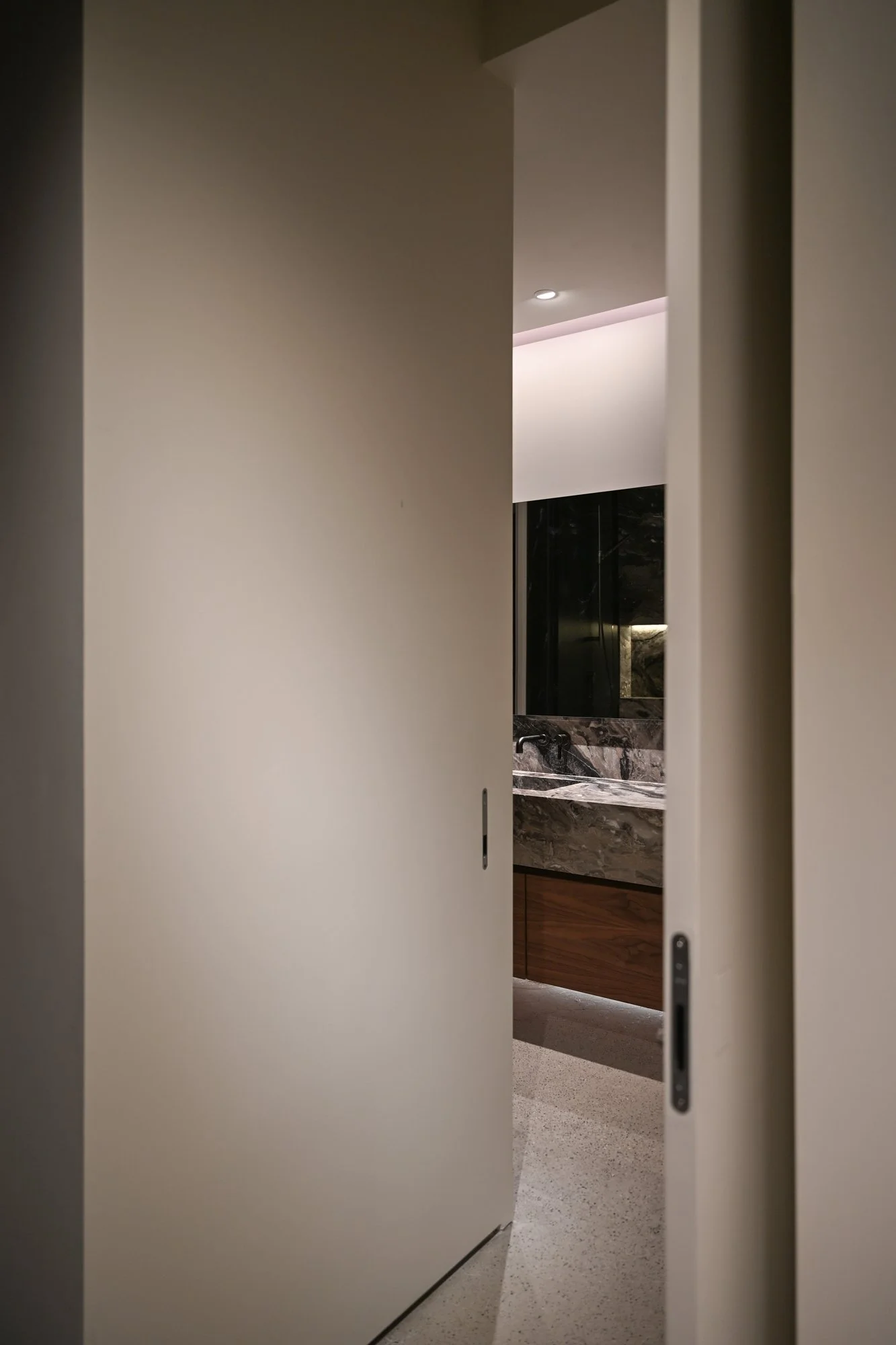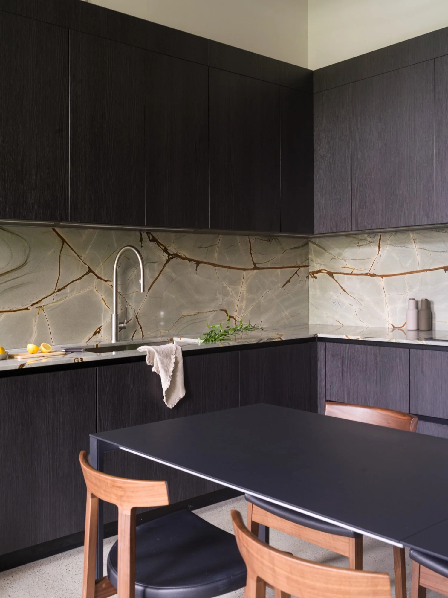 Storage solutions are equally considered, with an entire wall of bespoke Italian wardrobes by Inform Interiors providing seamless utility. In the bathroom, a palette of rich stone and walnut sets a serene tone, featuring a custom vanity and a steam shower appointed with sculptural fixtures by Gessi.