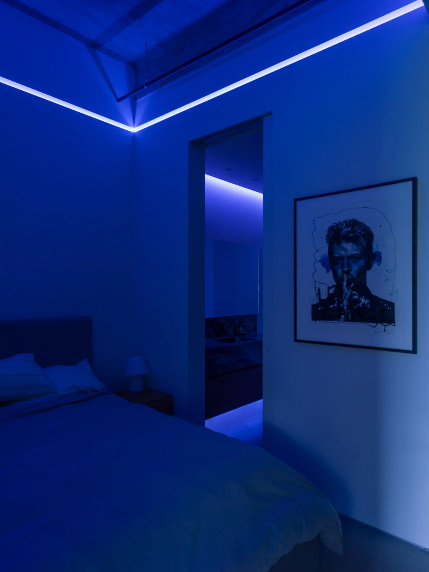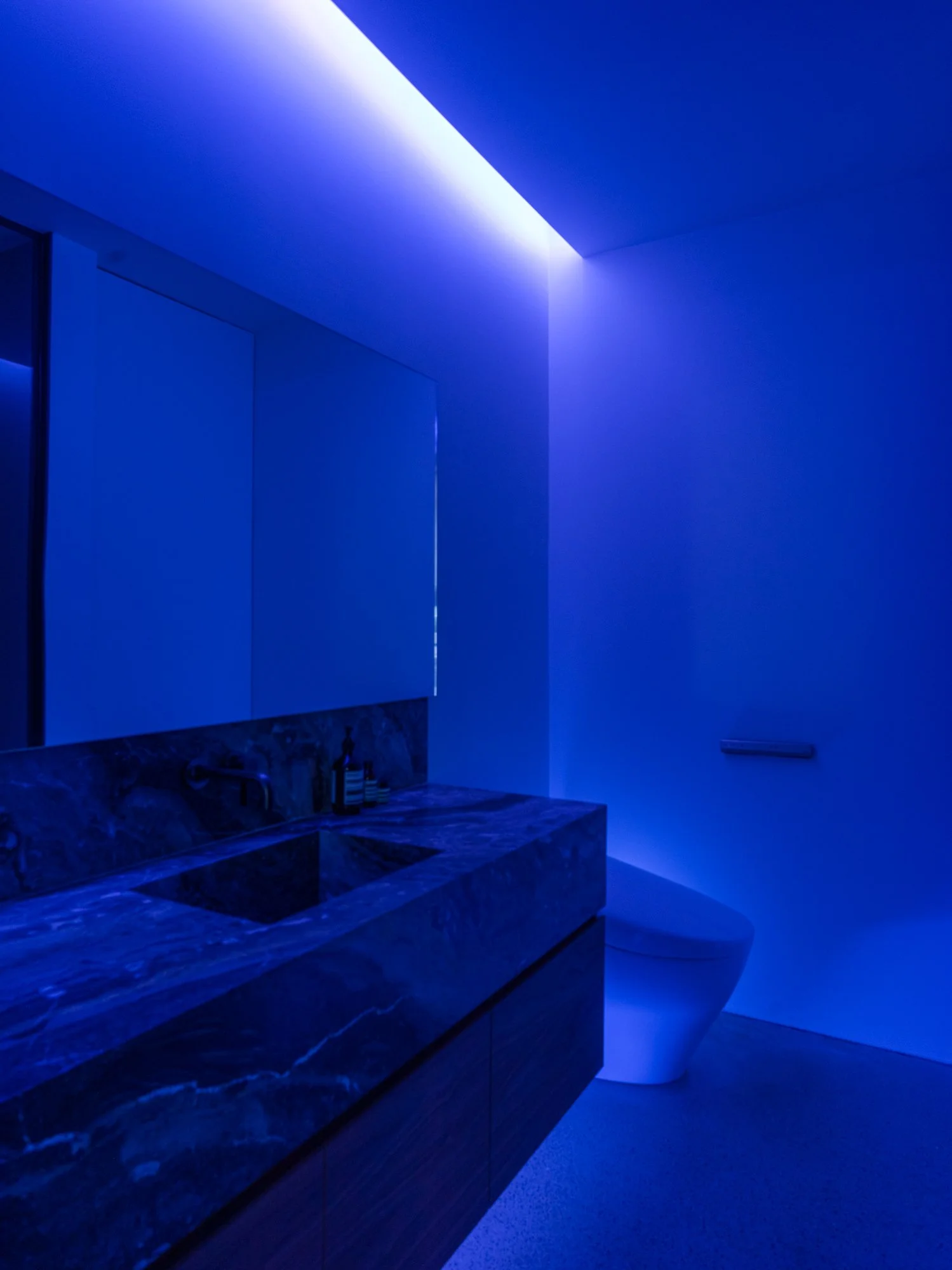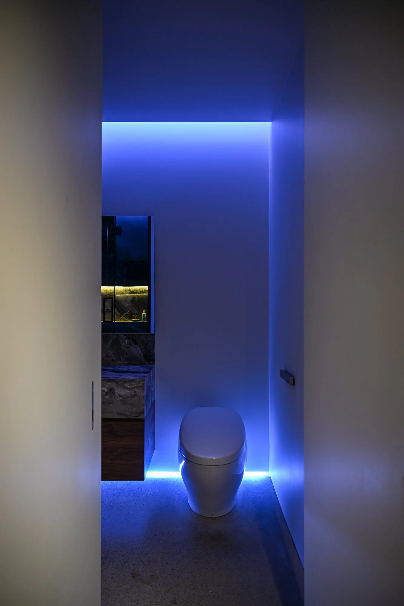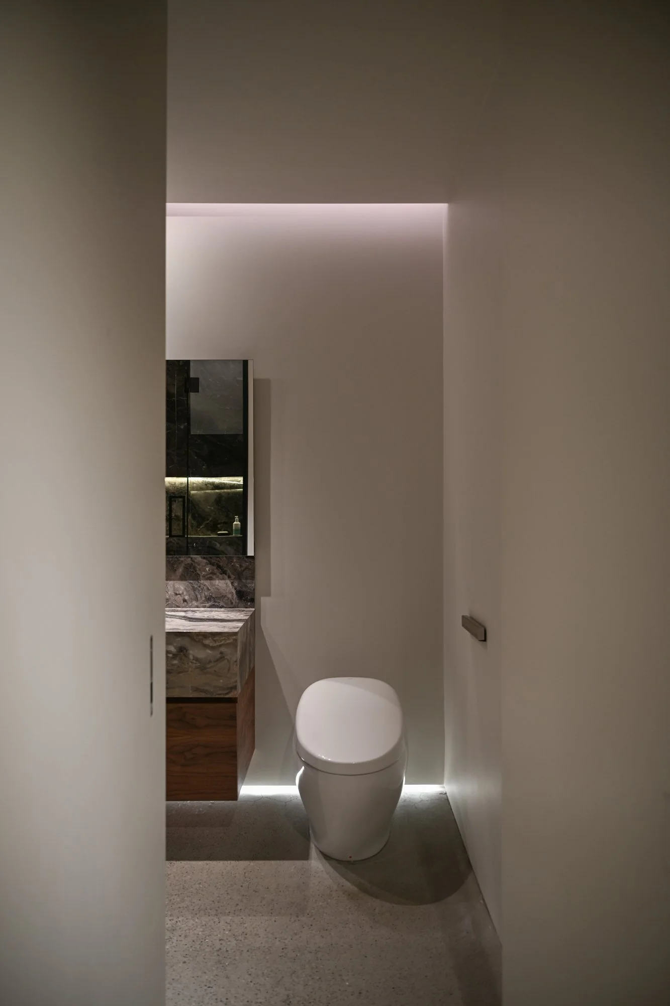 Storage solutions are equally considered, with an entire wall of bespoke Italian wardrobes by Inform Interiors providing seamless utility. In the bathroom, a palette of rich stone and walnut sets a serene tone, featuring a custom vanity and a steam shower appointed with sculptural fixtures by Gessi.