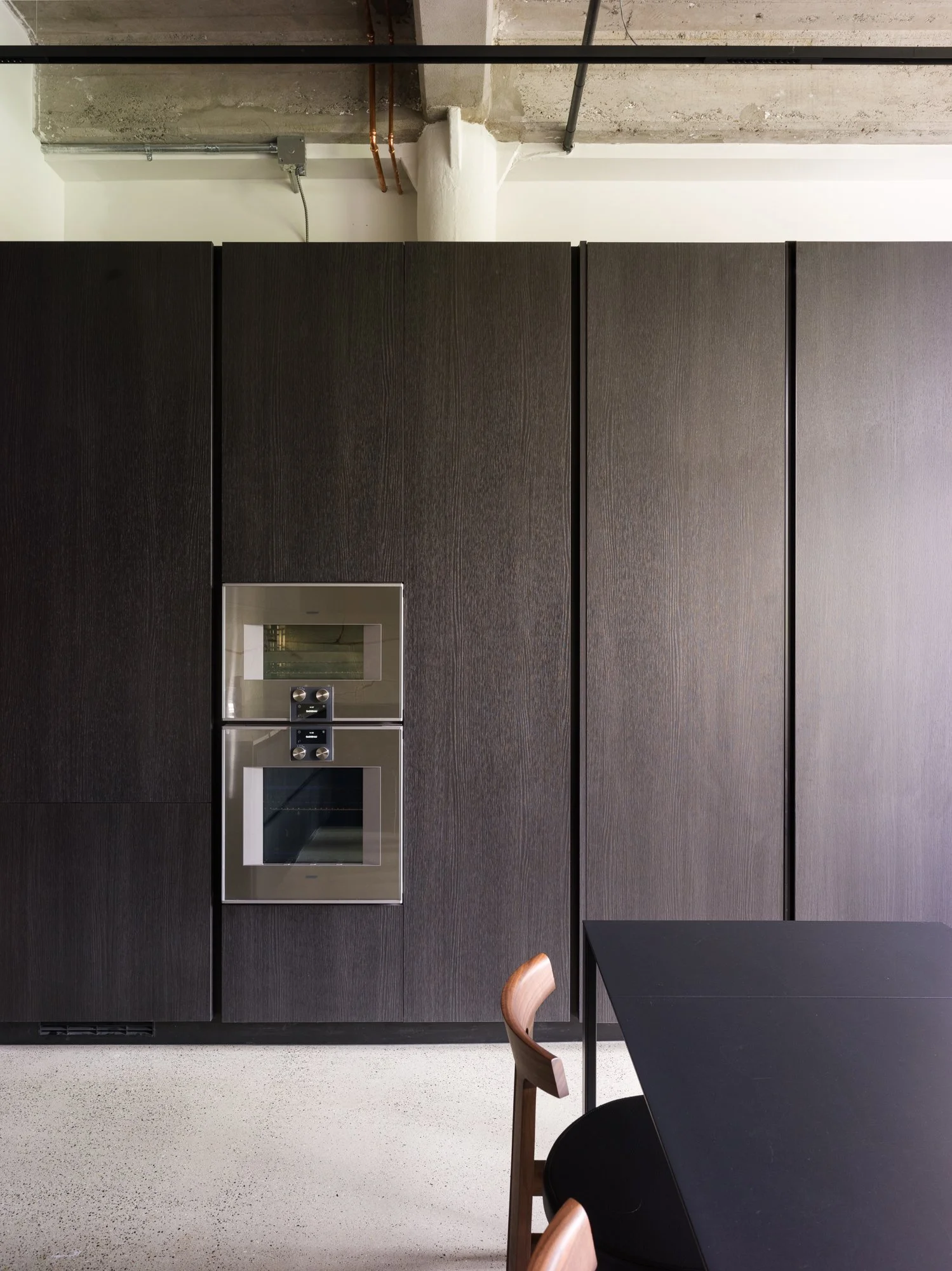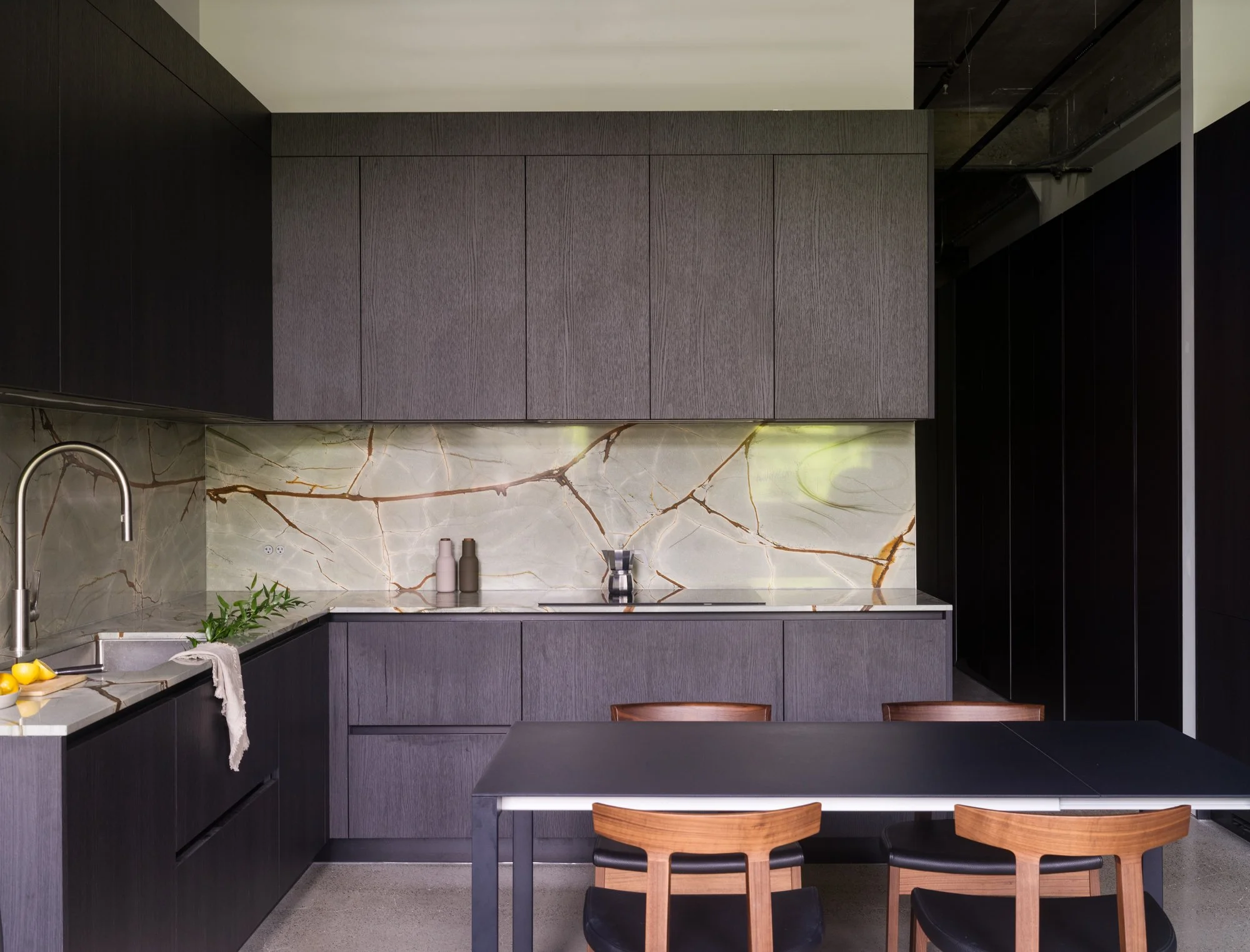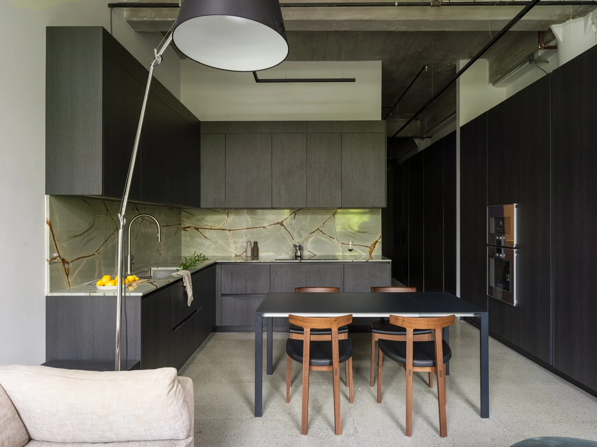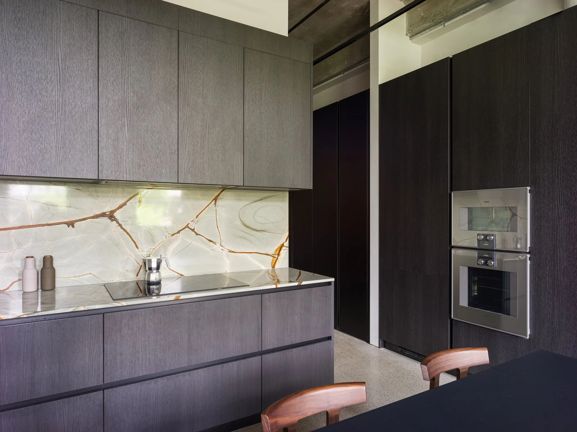 Reimagined and completed in 2024 by Kipp Design Build, the nearly 800-square-foot home reflects a sophisticated dialogue between heritage character and modern precision. The space has been entirely reconfigured to maximize function without compromising on materiality or mood. A bold, black Italian kitchen by Habitat anchors the main living space, paired with Gaggenau’s 400 Series appliances to create a culinary environment that is as high-performing as it is visually striking.