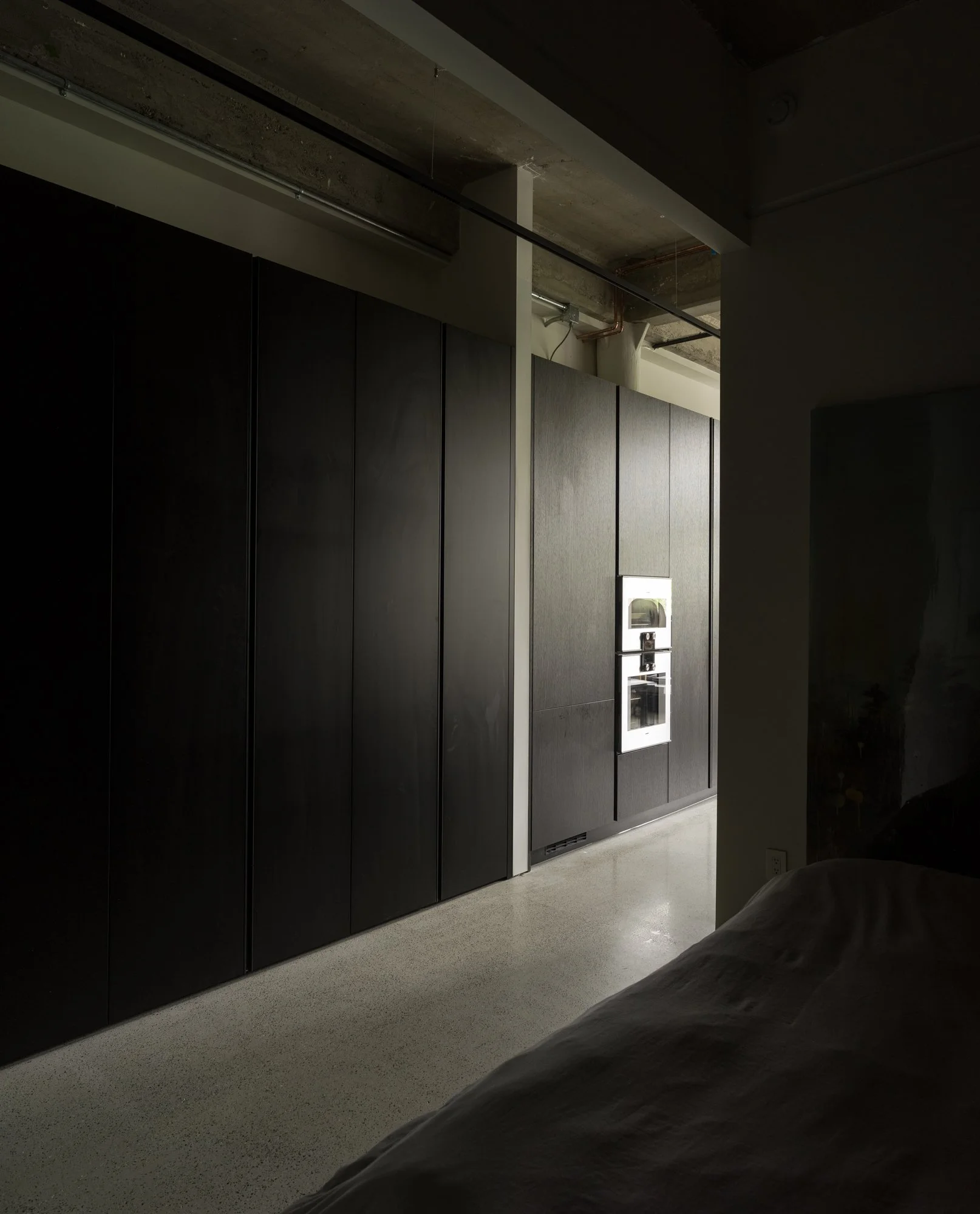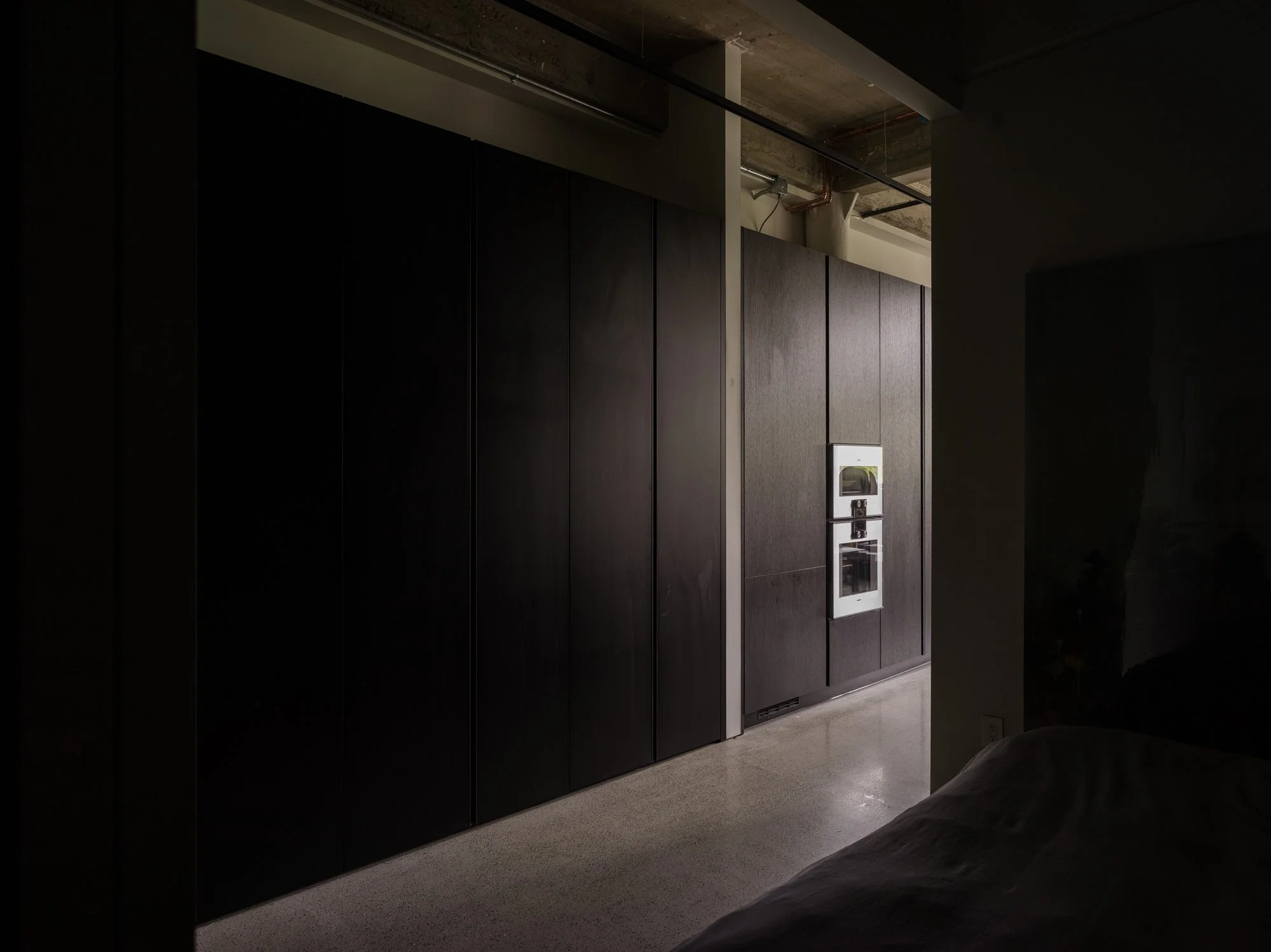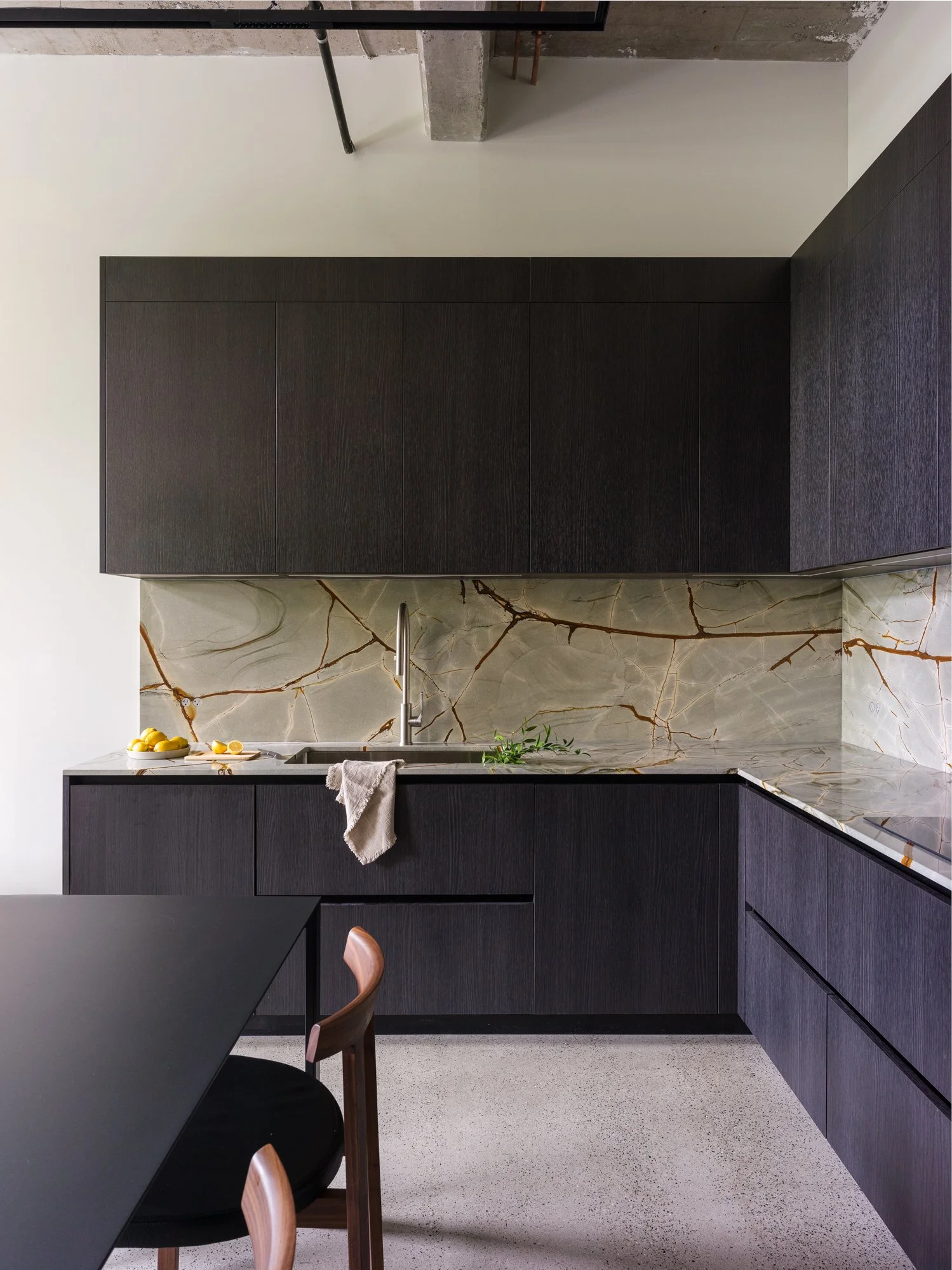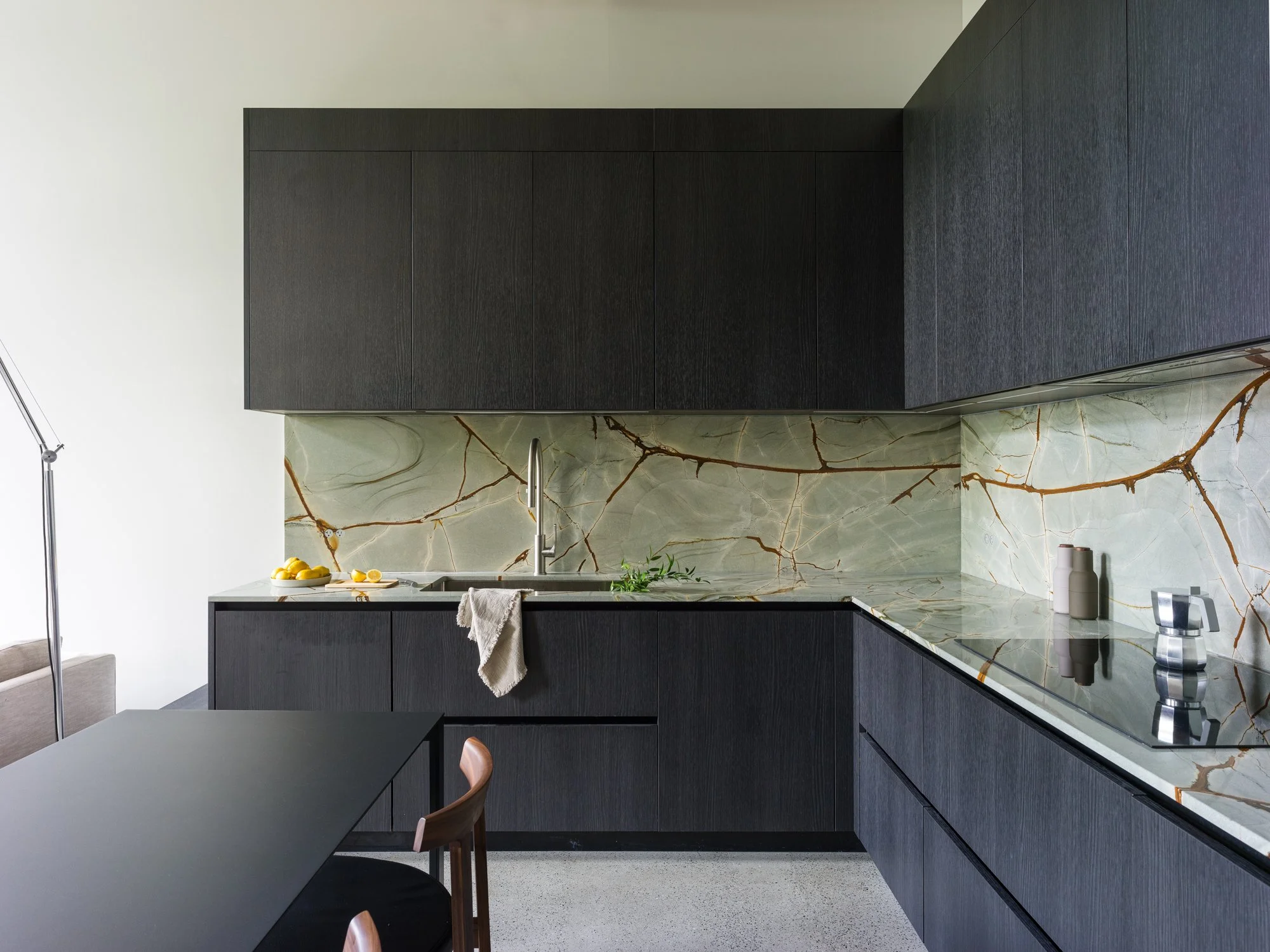 Reimagined and completed in 2024 by Kipp Design Build, the nearly 800-square-foot home reflects a sophisticated dialogue between heritage character and modern precision. The space has been entirely reconfigured to maximize function without compromising on materiality or mood. A bold, black Italian kitchen by Habitat anchors the main living space, paired with Gaggenau’s 400 Series appliances to create a culinary environment that is as high-performing as it is visually striking.